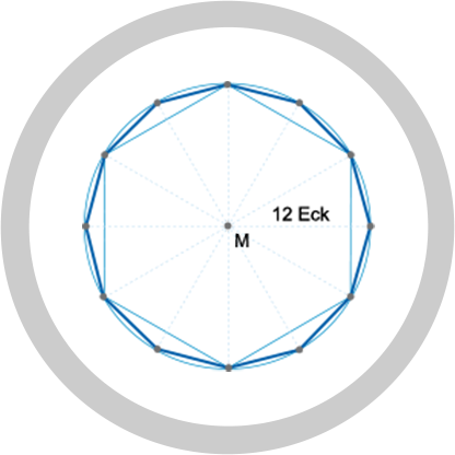 Der Vorteil dieses Sechsecks: Seine Kantenlänge entspricht dem Kreisradius. In einem Kreis mit einem Radius von 0,5 cm beträgt der Umfang des Sechsecks demnach 3 cm. Auf der Basis des Sechsecks lässt sich im Kreis ein Zwölfeck konstruieren und dessen Umfang berechnen.