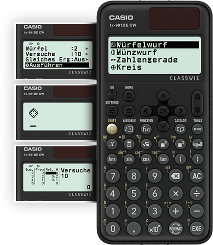 Mit dem fx-991DECW von CASIO erhalten Schüler*innen hierfür ein passendes Werkzeug. Das neuste Modell der ClassWiz-Serie verfügt über eine „Mathe-Box“, die Zufallsexperimente wie Münz- oder Würfelwürfe simulieren und daraus Datensätze erstellen kann. Auf diese Weise können die Jugendlichen ihren eigenen individuellen Datensatz erstellen – ohne Zeitverlust. Bis zu 250 Würfe auf einmal können mit dem fx-991DE CW simuliert werden. Die Daten lassen sich anschließend als Liste in anderen Anwendungen des Rechners weiter bearbeiten.