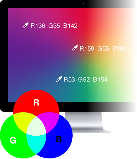 Die Darstellung von Farben auf einem Computer ist bemerkenswert genau. Der Clou: Jedes Farbpixel setzt sich aus der Kombination dreier Grundfarben, den sogenannten „Primärvalenzen“ zusammen. Diese Primärvalenzen sind Rot, Grün und Blauviolett. Zusammen bilden sie das RGB-System ( Rot-Grün-Blauviolett-System ). Es wird auch als „additives“ Farbmisch-System bezeichnet, da sich jeder Farbton durch jeweils einen Rot-, Grün- und Blauviolett-Wert zwischen 0 und 255 zusammensetzt.
