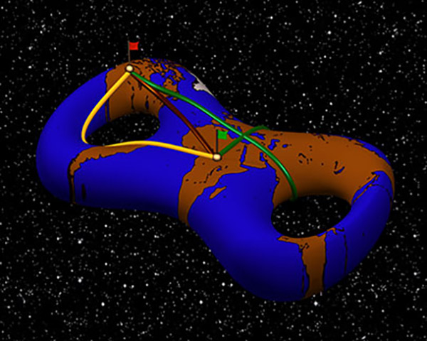 Bild rechts: Im Unterschied zu Geraden im euklidischen Raum können zwischen zwei Punkten auf einer Fläche verschiedene kürzeste Kurven (Geodätische) existieren (Ausschnitt aus dem Video „Geodesics and Waves“). Credit: Arnez, Polthier und Steffens, Teitzel