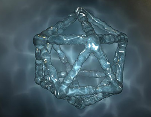 Bild rechts: Der Ikosaeder, einer der vier Platonischen Körper (Ausschnitt aus dem Film „Mesh – Eine Reise durch die diskrete Geometrie“ von Beau Janzen und Konrad Polthier). Credit: Janzen, Polthier