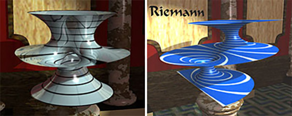 Bild oben links: Im Video „Palast der Seifenhäute“ von Beau Janzen und Konrad Polthier sind berühmte Minimalflächen zu sehen. Bild oben rechts: Die Entdeckungen von Bernhard Riemann und Celso José da Costa. Credit: Janzen, Polthier