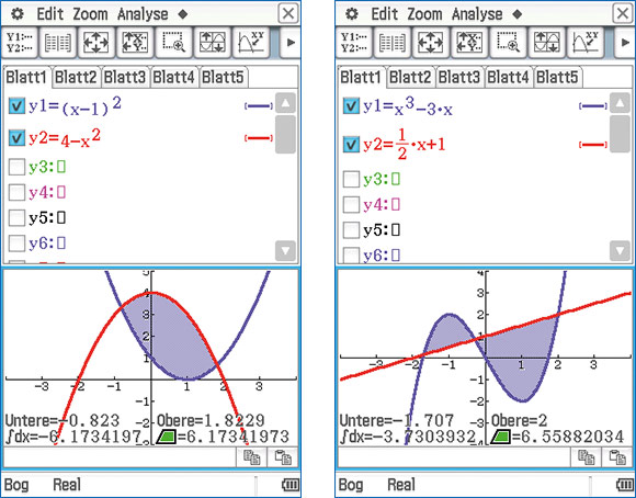 Die Integralflächen zwischen den Schnittpunkten mehrerer Funktionen können farbig dargestellt und berechnet werden.