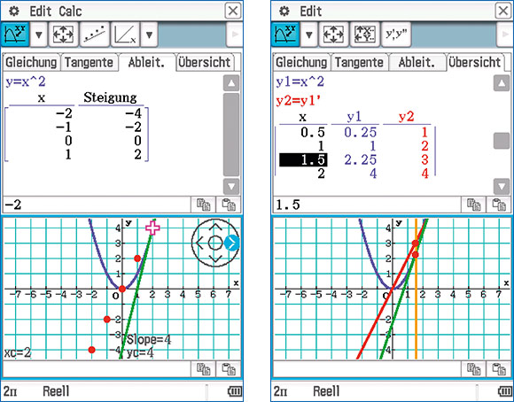 Diese Anwendung ermöglicht die Visualisierung des dynamischen Übergangs von der Sekantensteigung zur Tangentensteigung in einem frei wählbaren Punkt des dargestellten Graphen.