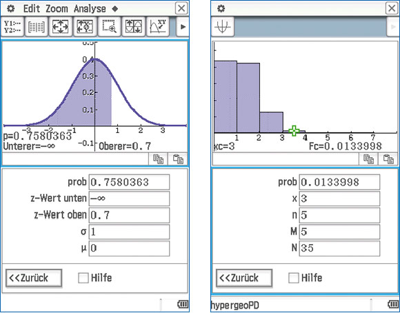 Assistenten helfen bei der Berechnung und Darstellung von Wahrscheinlichkeiten, Verteilungen und Tests.