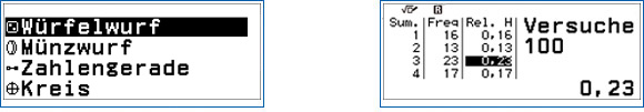 Mit der Mathebox lassen sich Würfel- und Münzwurfversuche simulieren. Die relativen Häufigkeiten der Summen können aufgelistet werden.