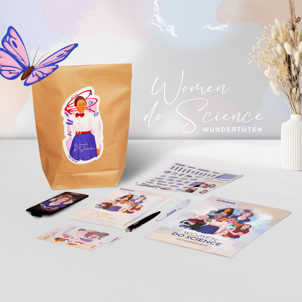 Lehrkräfte und Schüler*innen bekommen eine Emmy Noether-Wundertüte mit allen Materialien, die für das Projekt bereitgestellt werden, bei der Eröffnung am 23.04.